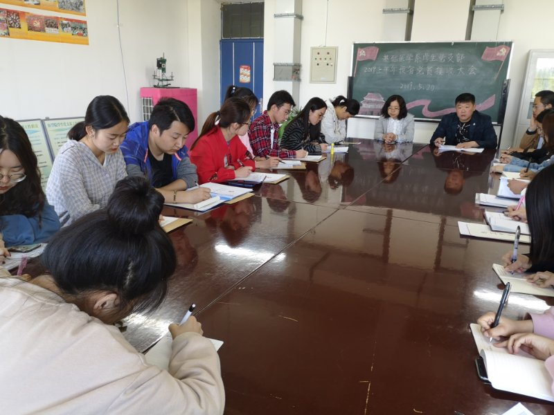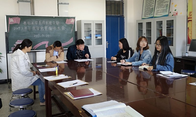 基础医学系学生党支部于2019年5月20日下午三点在基础医学系会议室召开了“基础医学系学生党支部2019上半年预备党员接收大会”。本次会议由基础医学系学生党支部书记宋国斌老师主持,基础医学系总支书记王喜英老师、学生党支部支委殷治华老师、于婧文老师、基础医学系学生入党培养人席国萍老师、基础医学系学生党支部全体党员、预备党员以及2019年上半年发展对象参加了本次会议。