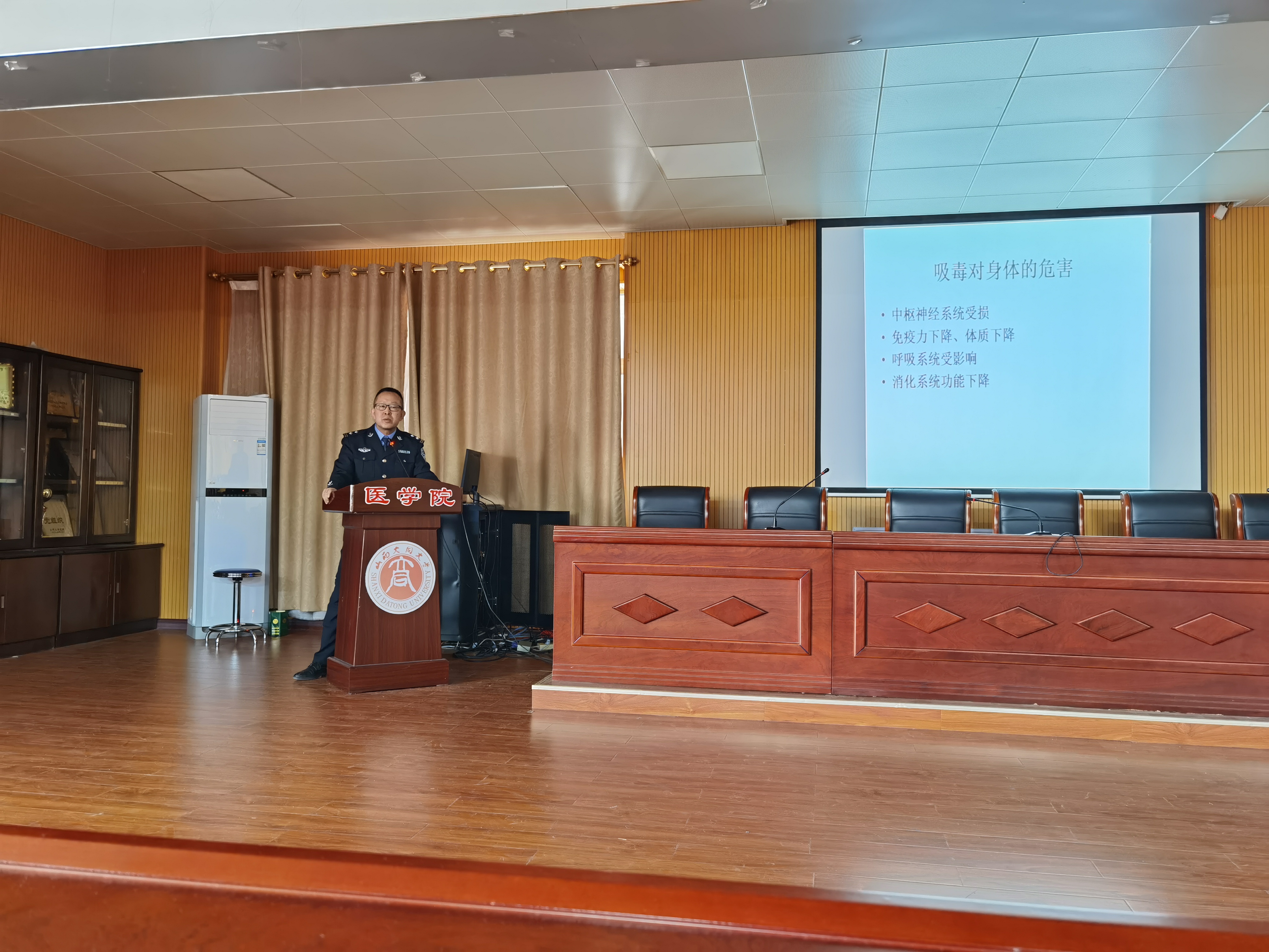 为增强医学院学生的禁毒意识,普及毒品预防知识,2024年11月1日,大同市强制隔离戒毒所走进医学院开展了一场意义深远的禁毒宣传教育活动。此次活动由大同市强制隔离戒毒所的马斌警官主讲,旨在通过展示毒品危害、剖析吸毒原因等内容,引导学生树立正确的价值观,远离毒品危害。