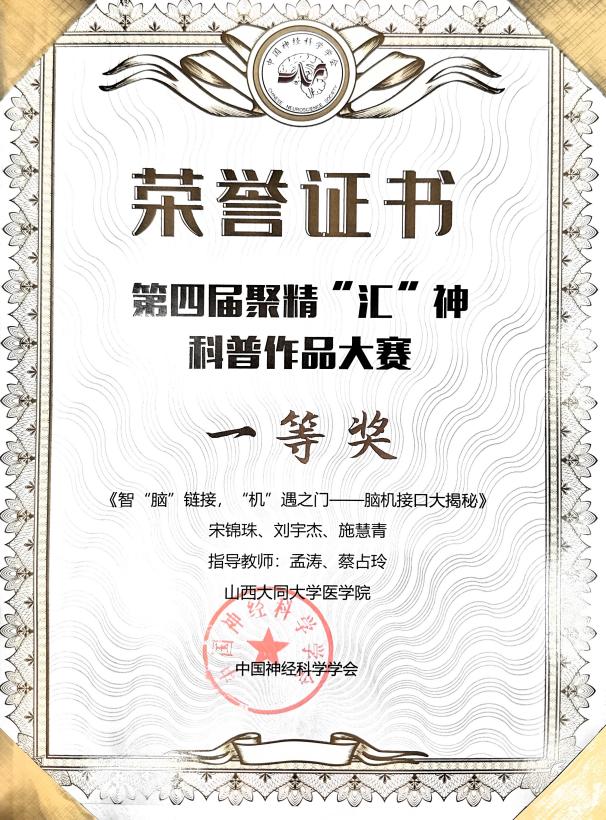 “科技创新与科学普及是实现创新发展的两翼,要把科学普及放在与科技创新同等重要的位置。”近日,在中国神经科学学会主办的第四届聚精“汇”神——神经科普作品大赛中,由我院临床医学专业学生宋锦珠、施慧青、刘宇杰同学共同创作的《智“脑”链接,“机”遇之门——脑机接口大揭秘》科普作品,从全国众多参赛作品中脱颖而出,荣获一等奖。