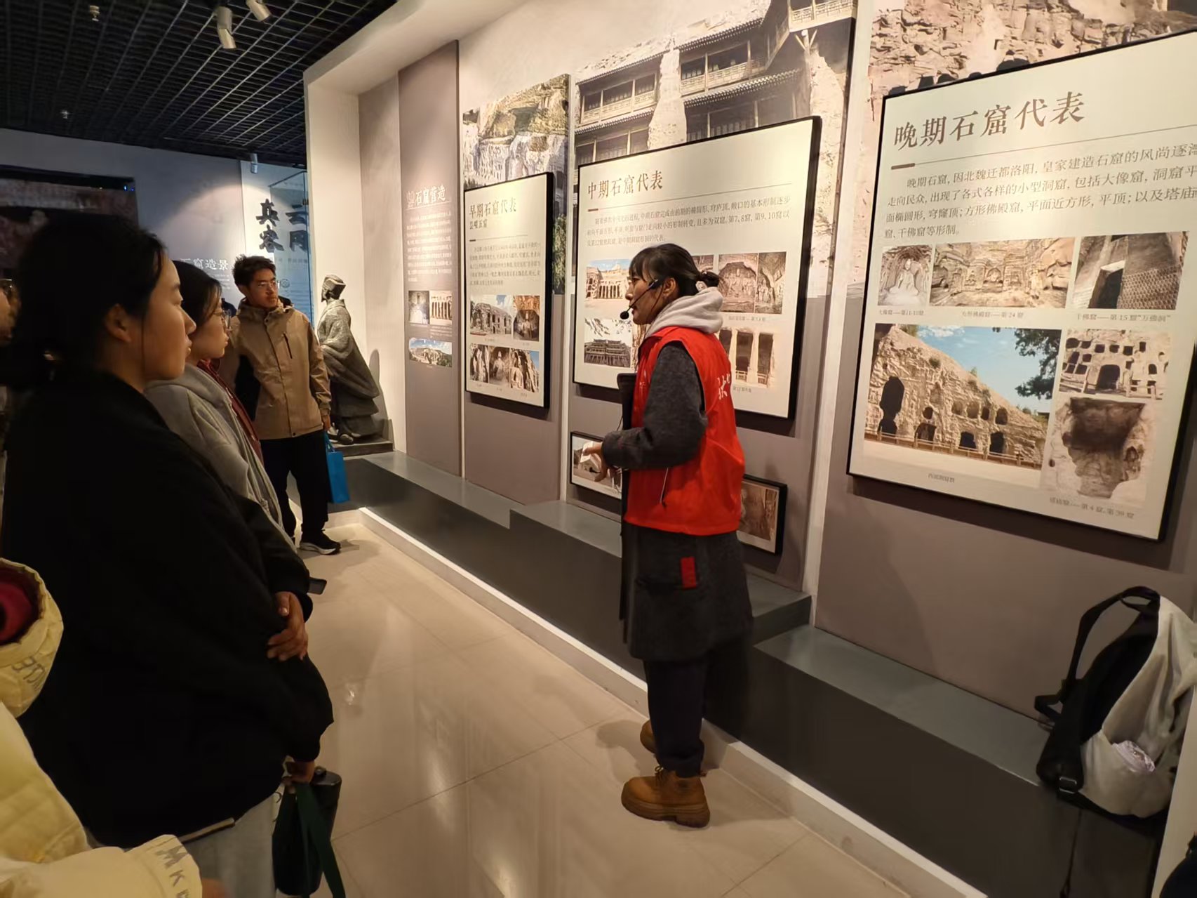 在陈列馆内,讲解员为同学们系统梳理了从北魏平城(今大同)的繁荣盛景,到世界文化遗产云冈石窟的开凿背景、雕刻艺术与文化融合历程。通过详实的史料与生动的讲解,同学们深刻认识到云冈石窟作为东西方文明交汇与多民族文化融合结晶的历史价值,并了解了其在考古、艺术及文旅融合等领域的当代意义。 参观过程中,同学们一边认真聆听讲解,一边不时与同伴交流感悟,展厅内洋溢着浓厚的学习氛围。