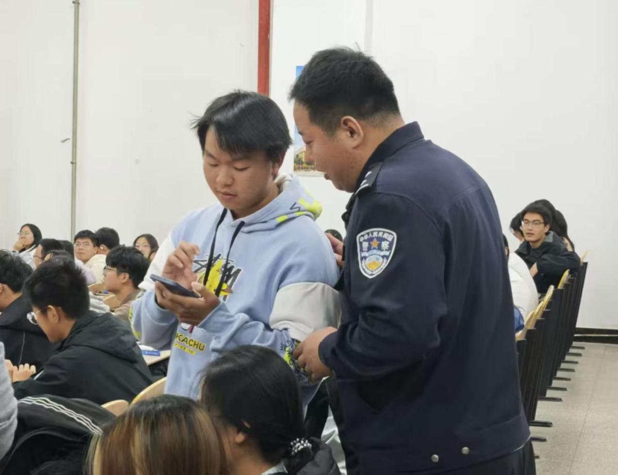 讲座伊始,谢丽君首先对庞乃鹏、王昱翔两位警官的到来表示热烈欢迎与衷心感谢。随后,庞乃鹏警官以多媒体课件为依托,结合校园高发案例,系统梳理了三类典型诈骗类型:一是网络交易诈骗;二是利用学生兼职需求设局的刷单返利诈骗;三是瞄准“资金缺口”的虚假网贷诈骗。他不仅传授了识别诈骗陷阱的技巧,还重点讲解了遭遇诈骗时的正确应对措施和报案渠道,并反复提醒同学们要时刻保持警惕,做到“不轻信、不透露、不转账”,牢牢守住自己的“钱袋子”。现场掌声不断,互动环节积极热烈,同学们在轻松的氛围中掌握了严肃而实用的安全知识。