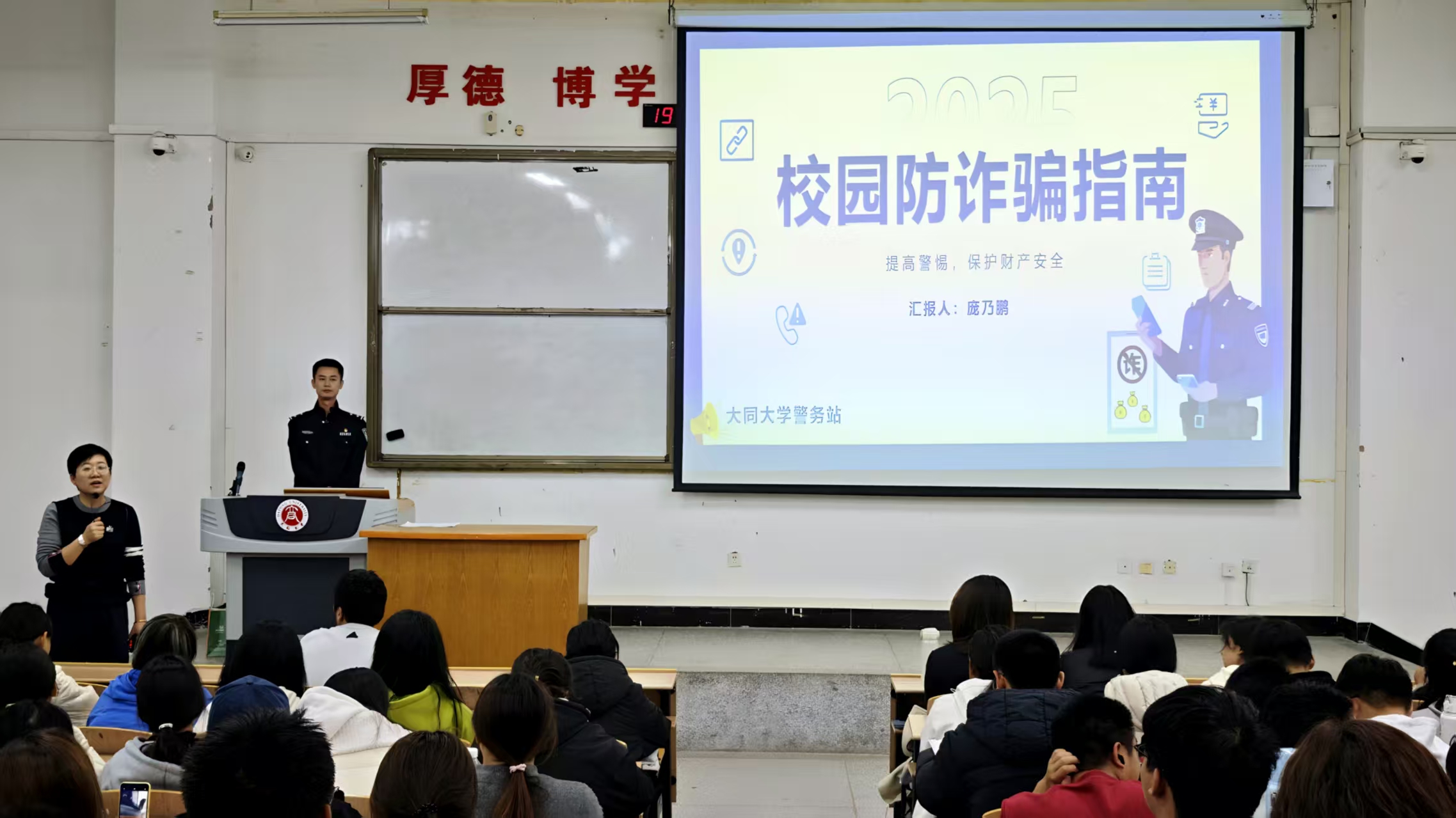 为切实提升医学院2025级新生反诈防骗意识与自我保护能力,筑牢校园安全防线,10月29日19时,医学院在仁和楼J01教室面向2025级全体新生,举办防诈安全教育专题讲座。本次活动特邀学校警务站经验丰富的庞乃鹏警官担任主讲人,医学院团委书记谢丽君、警务站王昱翔警官共同出席了此次活动。