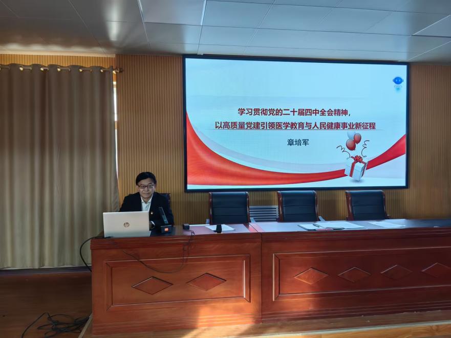 12月25日下午三点半,在仁和楼五楼报告厅,医学院党委书记章培军为全体教职工讲授题为《学习贯彻党的二十届四中全会精神,以高质量党建引领医学教育与人民健康事业新征程》的专题党课。