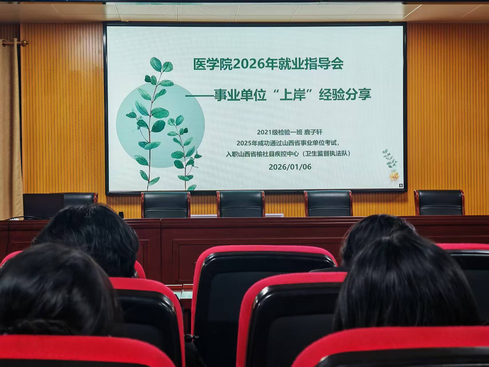 为精准助力医学院2026届毕业生实现高质量就业,清晰把握事业单位报考流程与备考策略,1月6日晚七点,医学院在仁和楼五楼报告厅成功举办了2026年就业指导会。本次分享会特别邀请了2021级医学检验技术专业一班,已于2025年成功考入山西省榆社县疾病预防控制中心(卫生监督执法队)的鹿子轩,通过线上学习通平台,为在校医学生带来了一场内容丰富、实用性强的"上岸"经验分享。本次活动采用线上与线下相结合的形式同步进行,吸引了260余人参加,医学院团委书记谢丽君担任活动主持人。