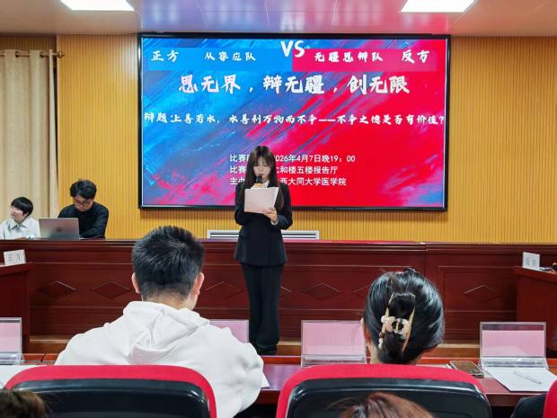 为提升医学生思辨与语言表达能力,引导医学生理性思考社会热点与人生价值,4月7日—4月8日,晚9:00,医学院在仁和楼五楼报告厅顺利举办“思无界,辩无疆,创无限”辩论赛。