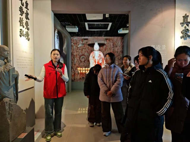 学生们在讲解员的引领下,步入陈列馆,立刻被馆内丰富的云冈文化遗存、石窟艺术复制品及学术研究成果所吸引。在云冈文化研究中心陈列馆,同学们通过珍贵的文物、详实的图文资料以及生动的讲解,系统了解了从北魏平城时代的社会风貌到石窟开凿的技术细节,从佛教艺术的东传轨迹到中外文化交流的历史图景,同学们沿着时间轴线,系统了解了云冈文化所承载的文明交融印记。云冈石窟作为世界文化遗产,其展现出的精湛技艺、多元文化包容性与不朽的生命力,引发了同学们的深深思考与赞叹。大家不仅为古代工匠的智慧与毅力所折服,更从文化交融与传承创新的角度,对专业学习与未来发展有了新的感悟。